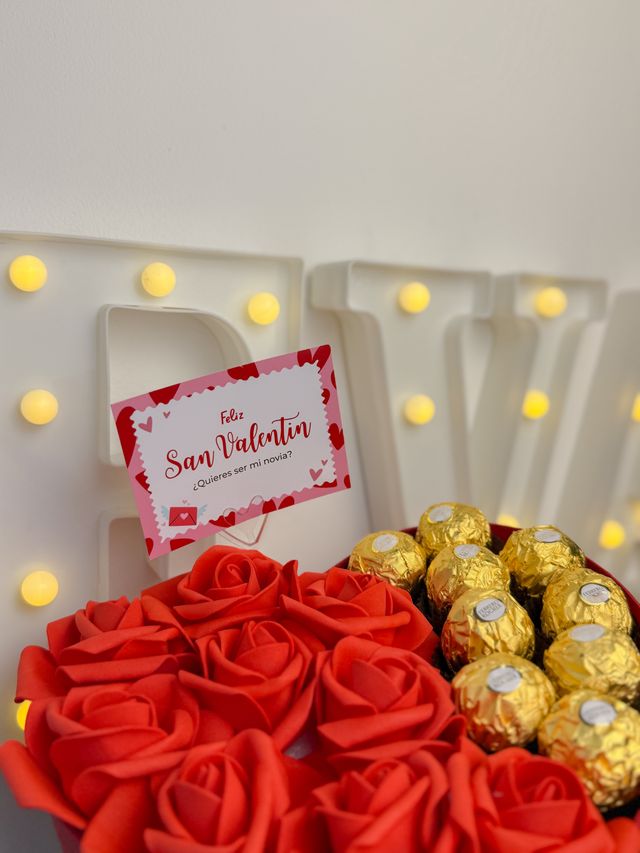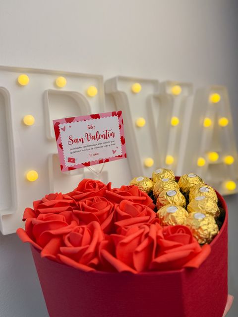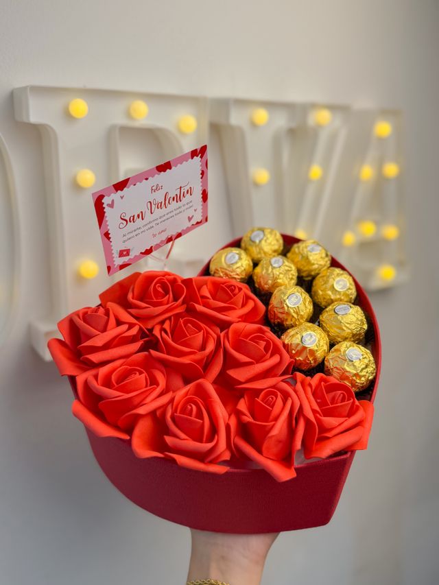 Esta box combina rosas, Ferrero Rocher y una tarjeta especial, para decir te amo de una forma inolvidable.