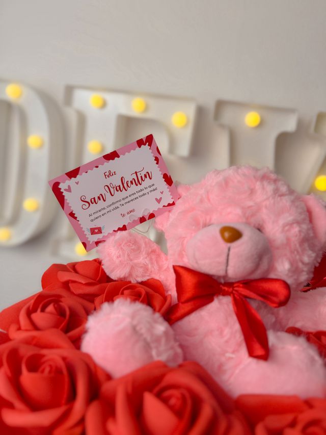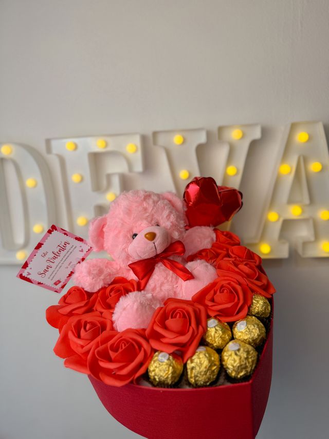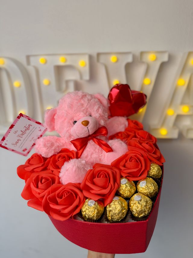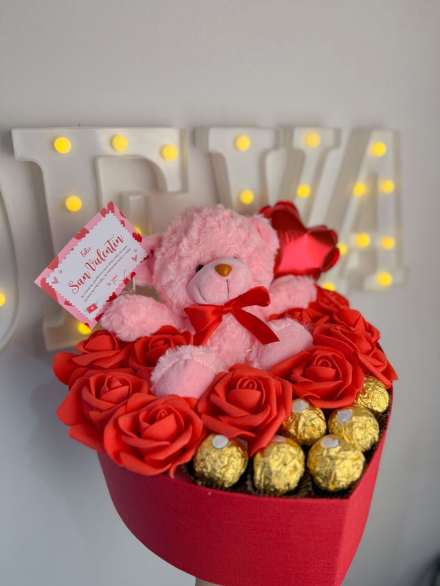 Esta box combina osito tierno, rosas y Ferrero Rocher, creando un detalle dulce, romántico y perfecto para sorprender.