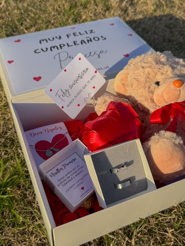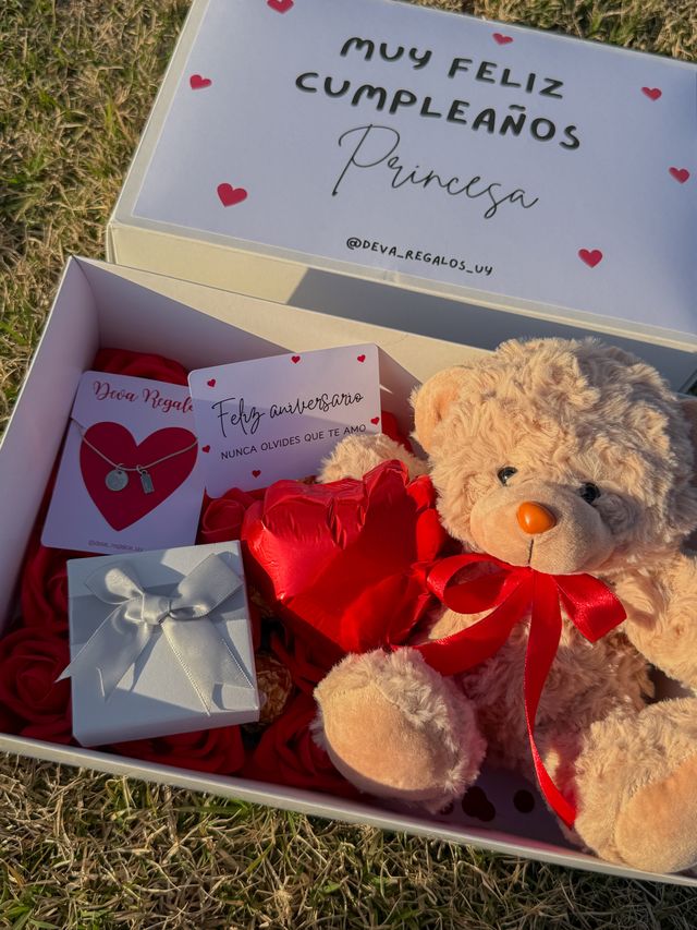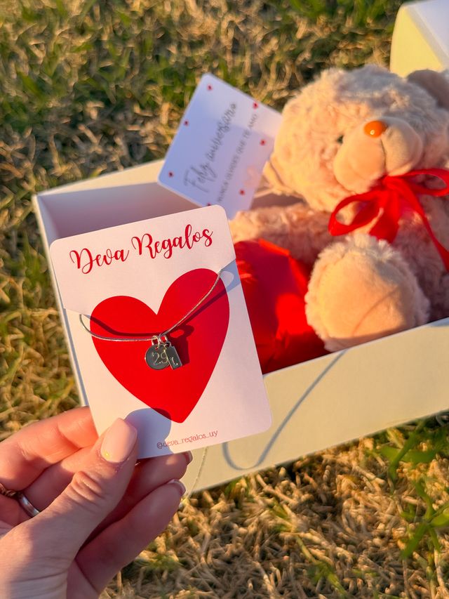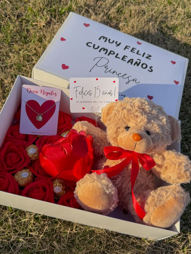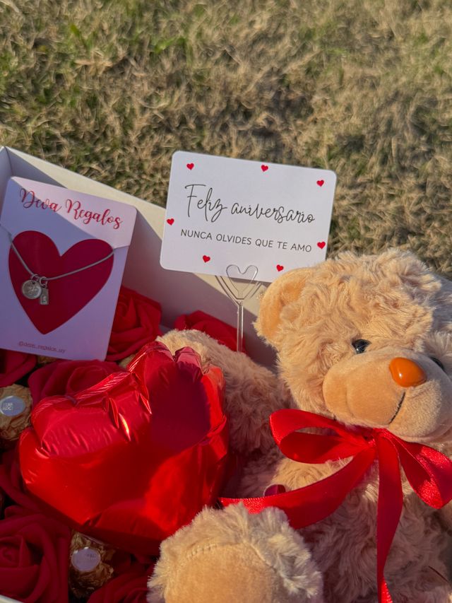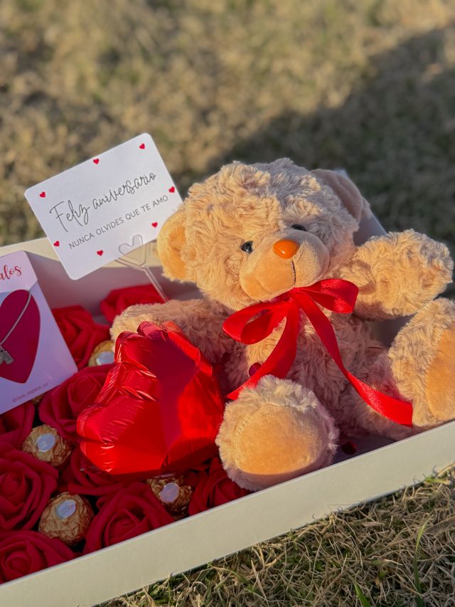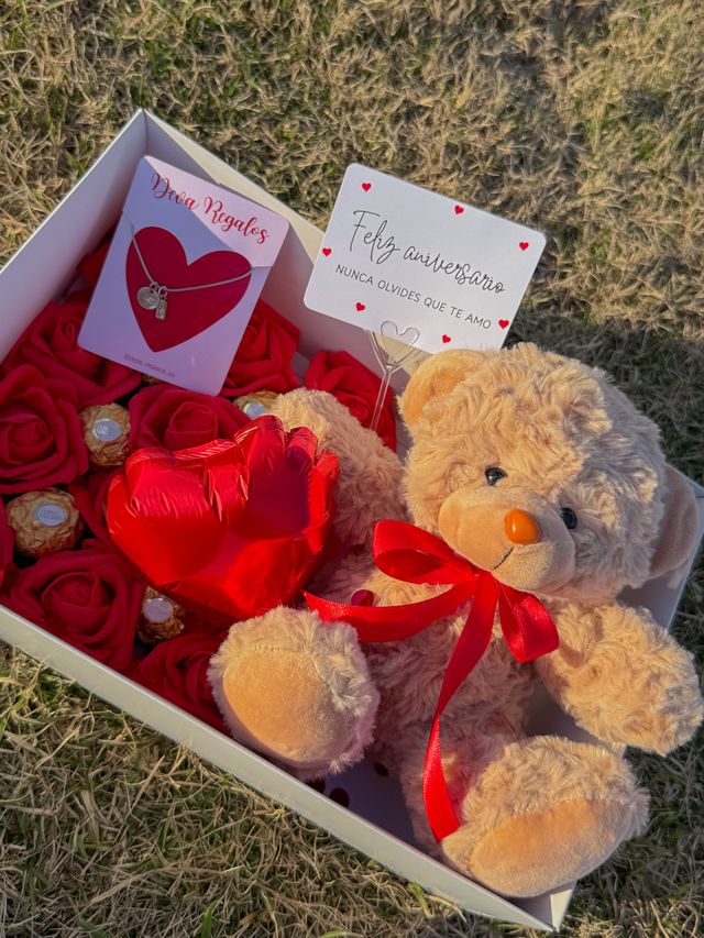 Incluye osito, chocolates, rosas eterna, tarjeta y collar con inicial + numero💌